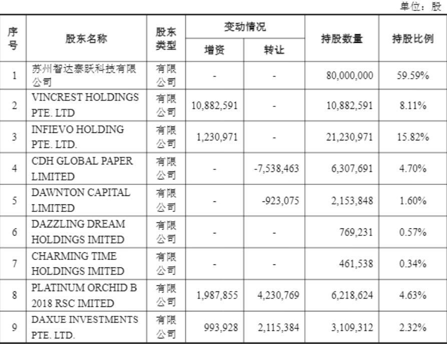本次增資的同時(shí),TeraHop股東還進(jìn)行了部分股份轉(zhuǎn)讓操作。公告顯示,CDH GLOBAL PAPER LIMITED將其持有的188.46萬股股份轉(zhuǎn)讓給Daxue,將其持有的188.46萬股股份轉(zhuǎn)讓給True Light,將其持有的376.92萬股轉(zhuǎn)讓給Platinum Orchid;DAWNTON CAPITAL LIMITED將其持有的23.08萬股股份轉(zhuǎn)讓給Daxue,將其持有的23.08萬股股份轉(zhuǎn)讓給True Light,將其持有的46.15萬股轉(zhuǎn)讓給Platinum Orchid。