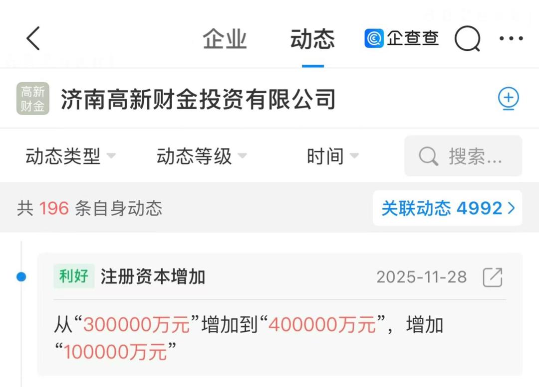 近日,濟南高新財金投資有限公司(下稱“濟南高新財金”)發生工商變更,新增濟南高新產業投資發展有限公司(下稱“濟高產投”)為股東。同時,注冊資本由30億元增至40億元,增幅33.33%。