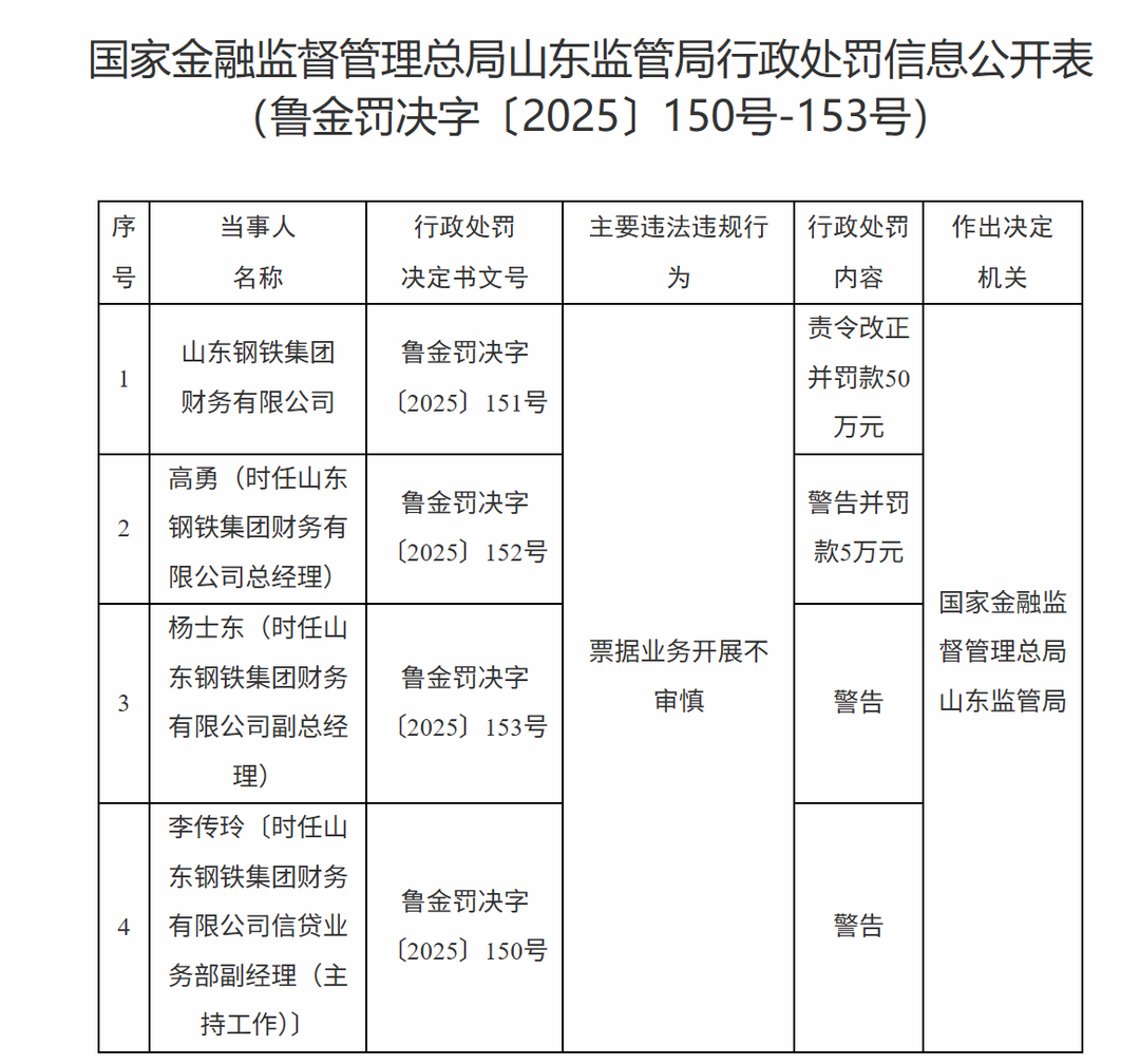 行政處罰決定信息公示表(魯金罰決字〔2025〕150號-153號)顯示,因票據(jù)業(yè)務(wù)開展不審慎,山鋼集團(tuán)財(cái)務(wù)公司被責(zé)令改正并罰款50萬元,時(shí)任山鋼集團(tuán)財(cái)務(wù)公司總經(jīng)理高勇被警告并罰款5萬元,時(shí)任山鋼集團(tuán)財(cái)務(wù)公司副總經(jīng)理?xiàng)钍繓|被警告,時(shí)任山鋼集團(tuán)財(cái)務(wù)公司信貸業(yè)務(wù)部副經(jīng)理(主持工作)李傳玲被警告。