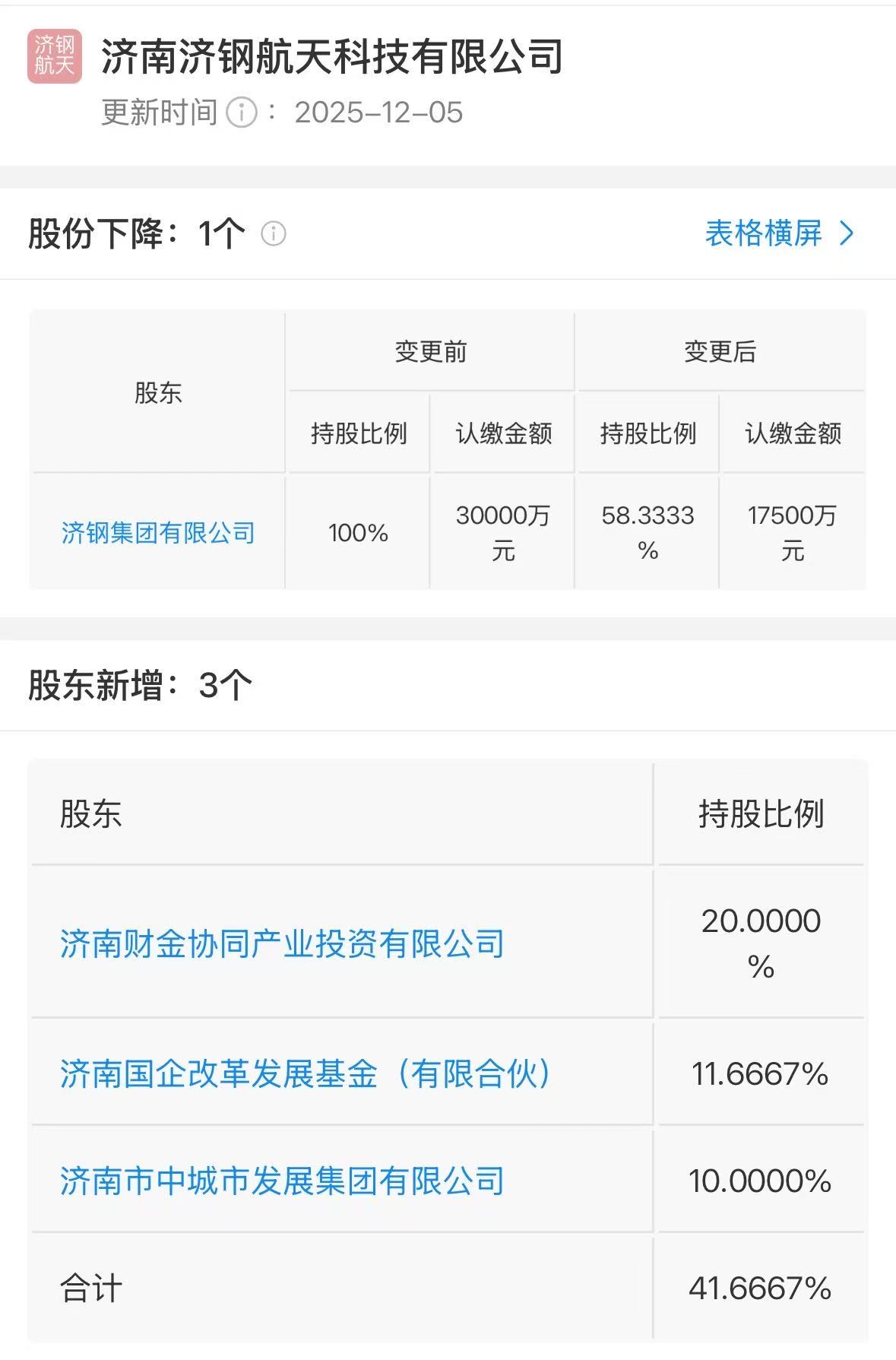 12月5日,濟(jì)南濟(jì)鋼航天科技有限公司(下稱“濟(jì)鋼航天科技”)發(fā)生工商變更,原控股股東濟(jì)鋼集團(tuán)持股比例從100%稀釋至58.33%,新增股東濟(jì)南財(cái)金協(xié)同產(chǎn)業(yè)投資有限公司(持股20%)、濟(jì)南國企改革發(fā)展基金(有限合伙)(持股11.67%)、濟(jì)南市中城市發(fā)展集團(tuán)(持股10%)合計(jì)持股41.67%,標(biāo)志著濟(jì)南國資在“航天科技”領(lǐng)域的布局邁出關(guān)鍵一步。