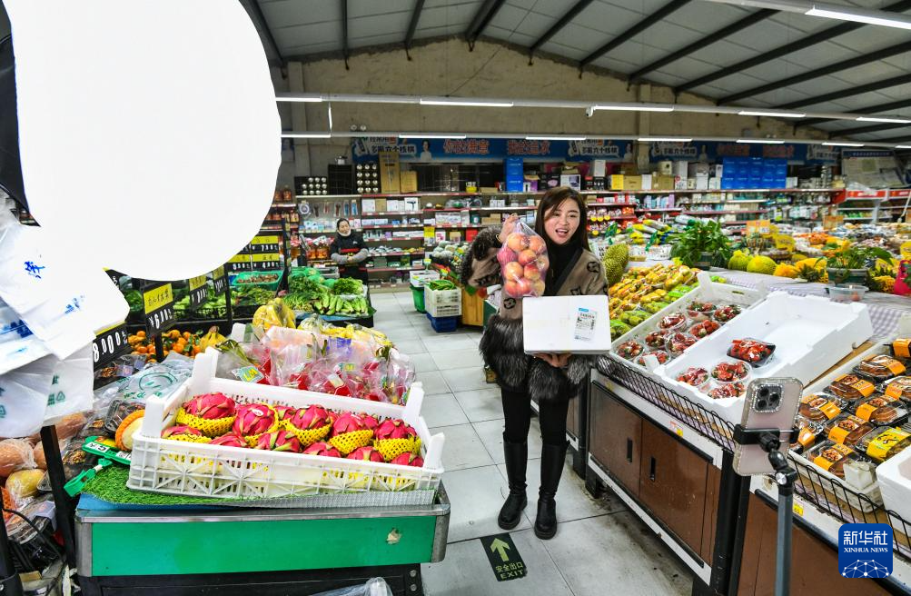 12月18日,在山東省樂陵市西段茂盛超市快遞服務(wù)網(wǎng)點,工作人員在直播帶貨。