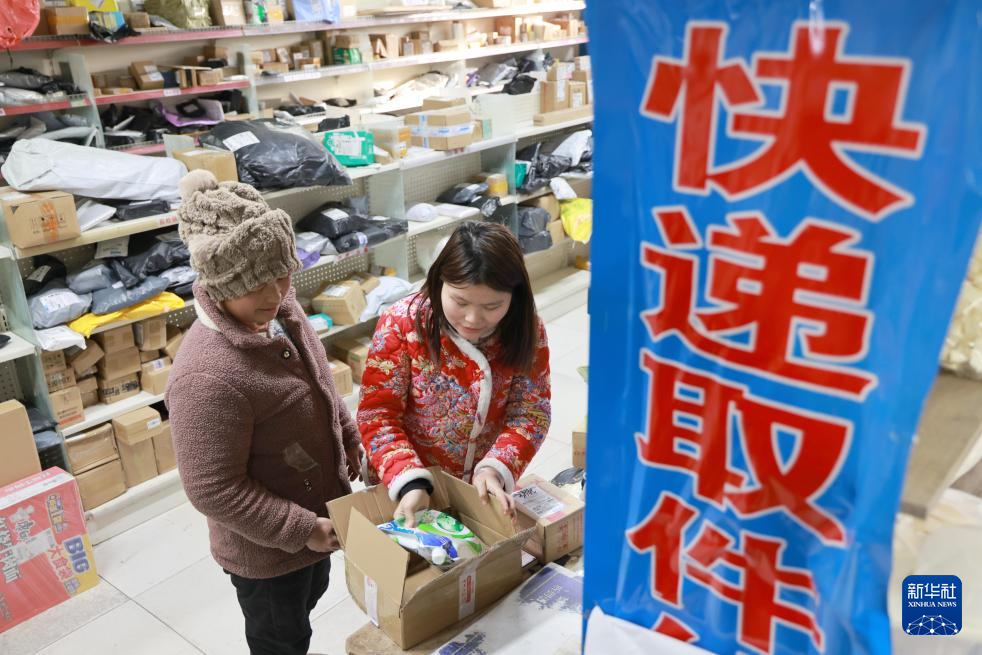 12月18日,在山東省樂陵市西段茂盛超市快遞服務(wù)網(wǎng)點,工作人員幫助村民取快遞。