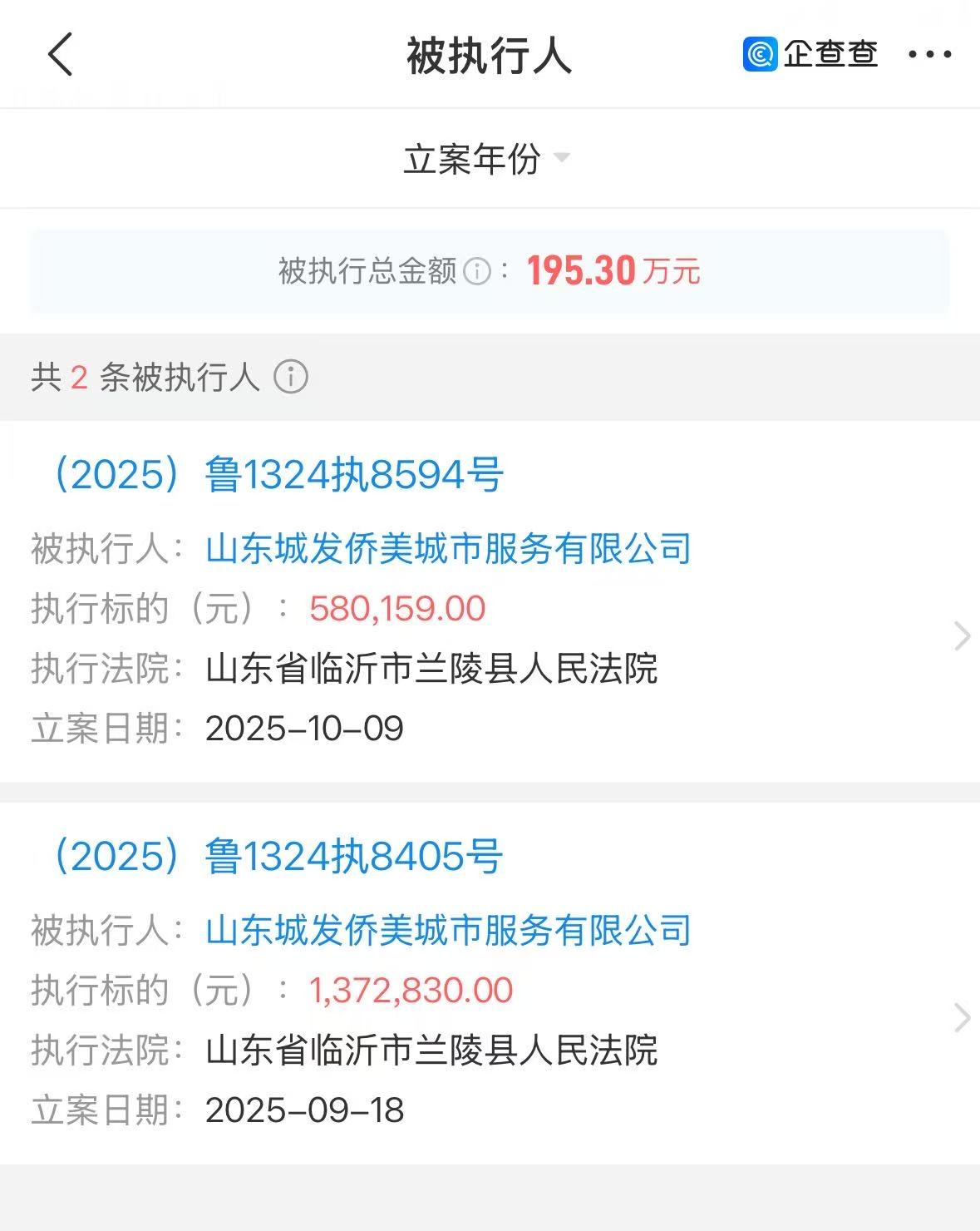 不過,僑銀股份與蘭陵縣國企蘭陵縣美城環(huán)衛(wèi)保潔工程有限公司合資成立的控股子公司山東城發(fā)僑美城市服務(wù)有限公司今年9月、10月兩次被臨沂市蘭陵縣人民法院列為被執(zhí)行人,執(zhí)行標(biāo)的為137.28萬元、58.02萬元,合計(jì)執(zhí)行金額195.3萬元。